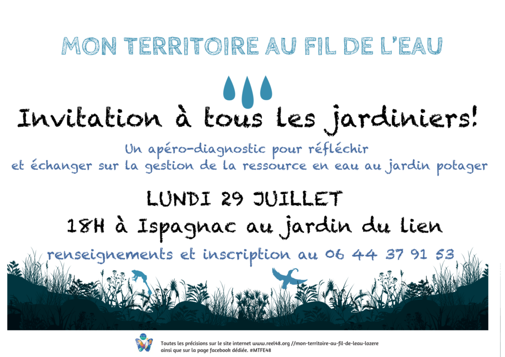 « Mon territoire au fil de l’eau » : des animations inédites proposées aux jardiniers.es, aux habitants.es et leurs élus.es. Programme mené sur deux territoires pilotes en Lozère en 2024, financé par l’Agence de l’eau, la Région Occitanie et le Département de la Lozère. Avec le soutien de la commune d’Ispagnac et des partenaires et sympathisants locaux !